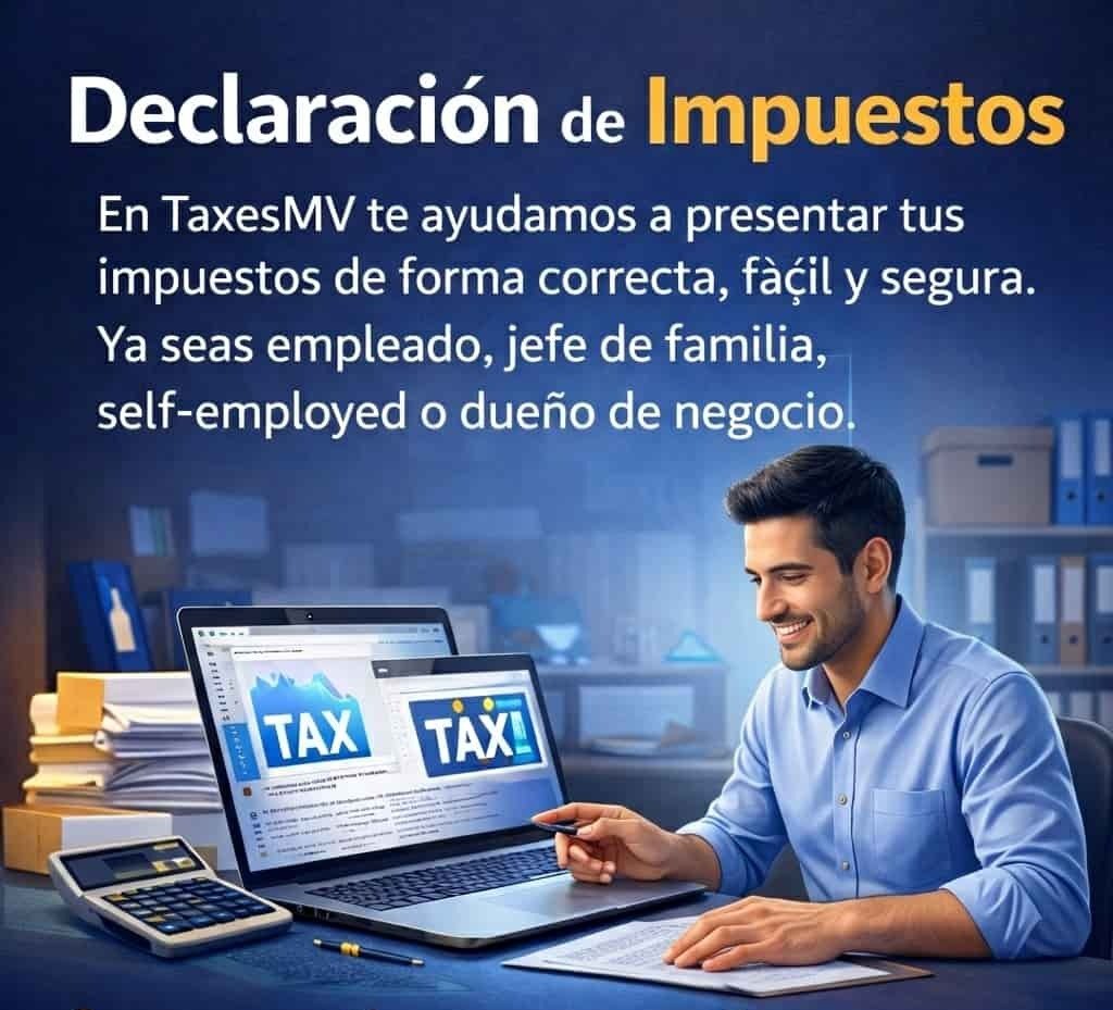 En TaxesMV te ayudamos a presentar tus impuestos de forma correcta, fàcil y segura . Ya seas empleado, Jefe de familia, self-employed o dueño de negocio, analizamos cada detalle para que cumplas con el IRS sin preocupaciones.